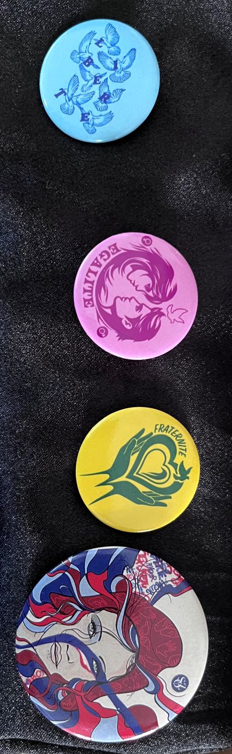 Les badges vendus représentent des œuvres créées l'an dernier à partir des valeurs de la devise républicaine « Liberté, Égalité, Fraternité » par des élèves de notre établissement lors d'ateliers avec l'artiste sérigraphe Pierre XZXZ.