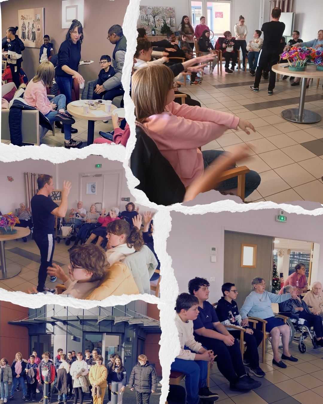 Les élèves du dispositif ULIS et de la classe IME et leurs encadrants se sont en effet rendus à la maison de retraite pour une rencontre intergénérationnelle rafraîchissante. Ils ont commencé par expliquer l’objet de leur venue, ont ensuite remis leurs cadeaux aux résidents présents, participé à un cours de gym inattendu puis dégusté un goûter.