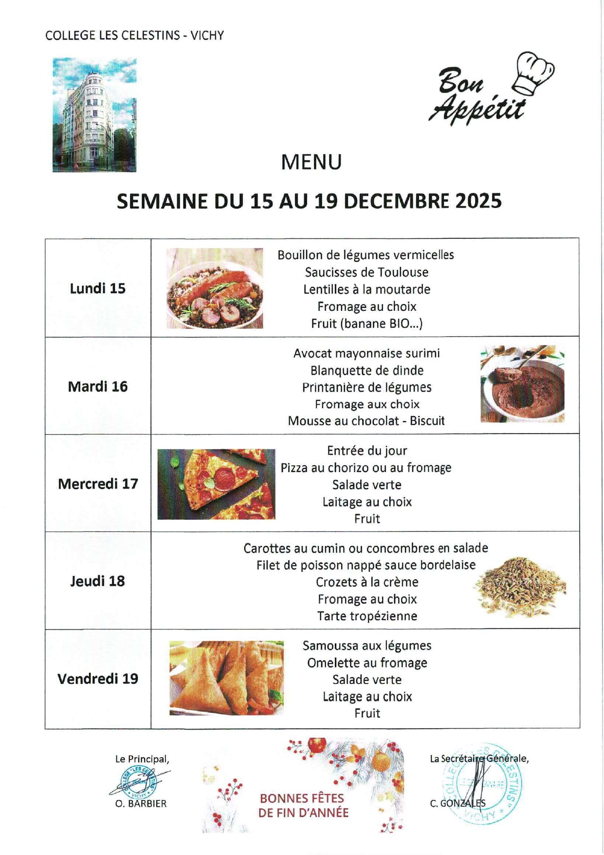 MENU DE LA SEMAINE DU 15 AU 19 DECEMBRE 2025