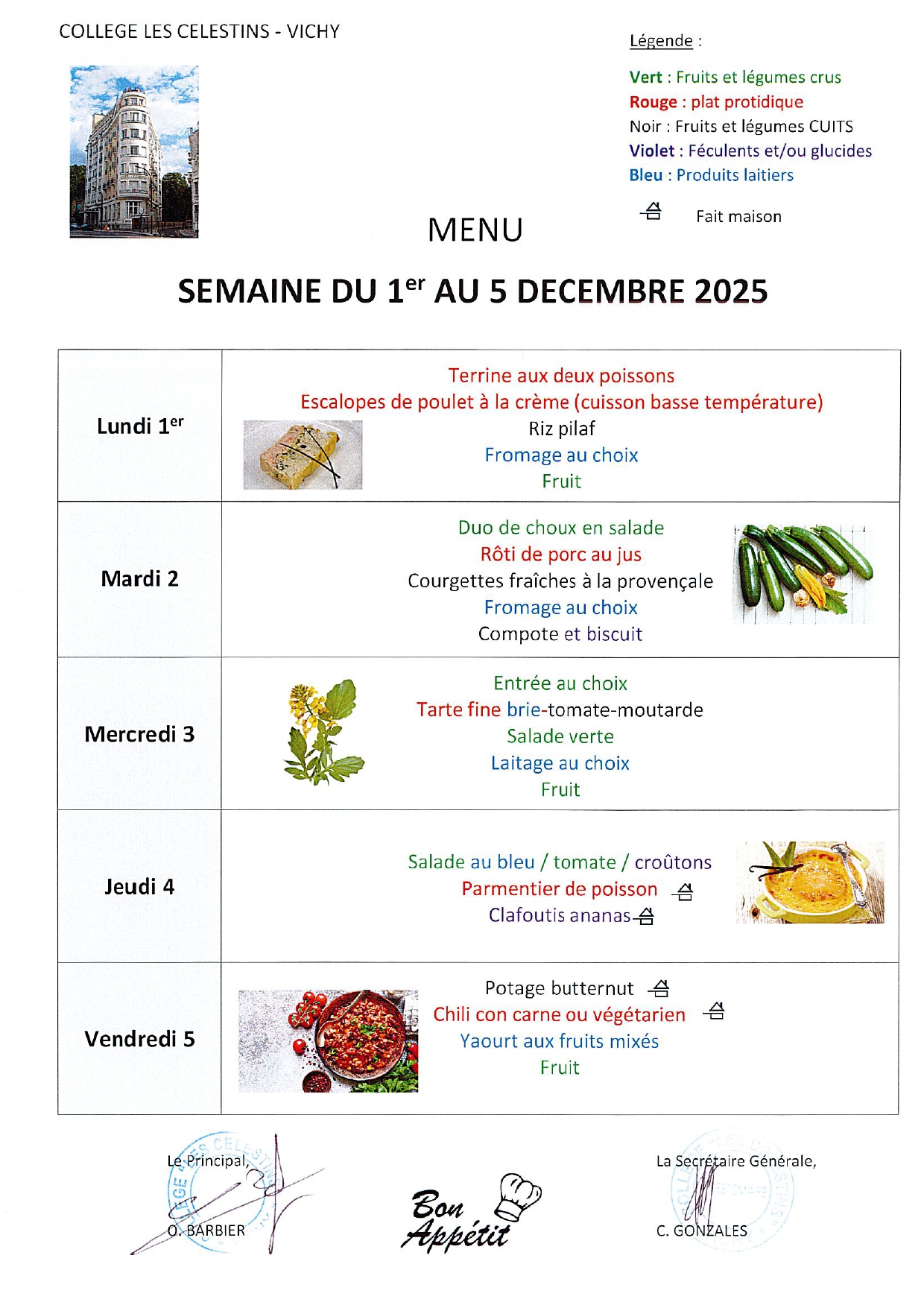 MENU DE LA SEMAINE DU 1er AU 5 DECEMBRE 2025