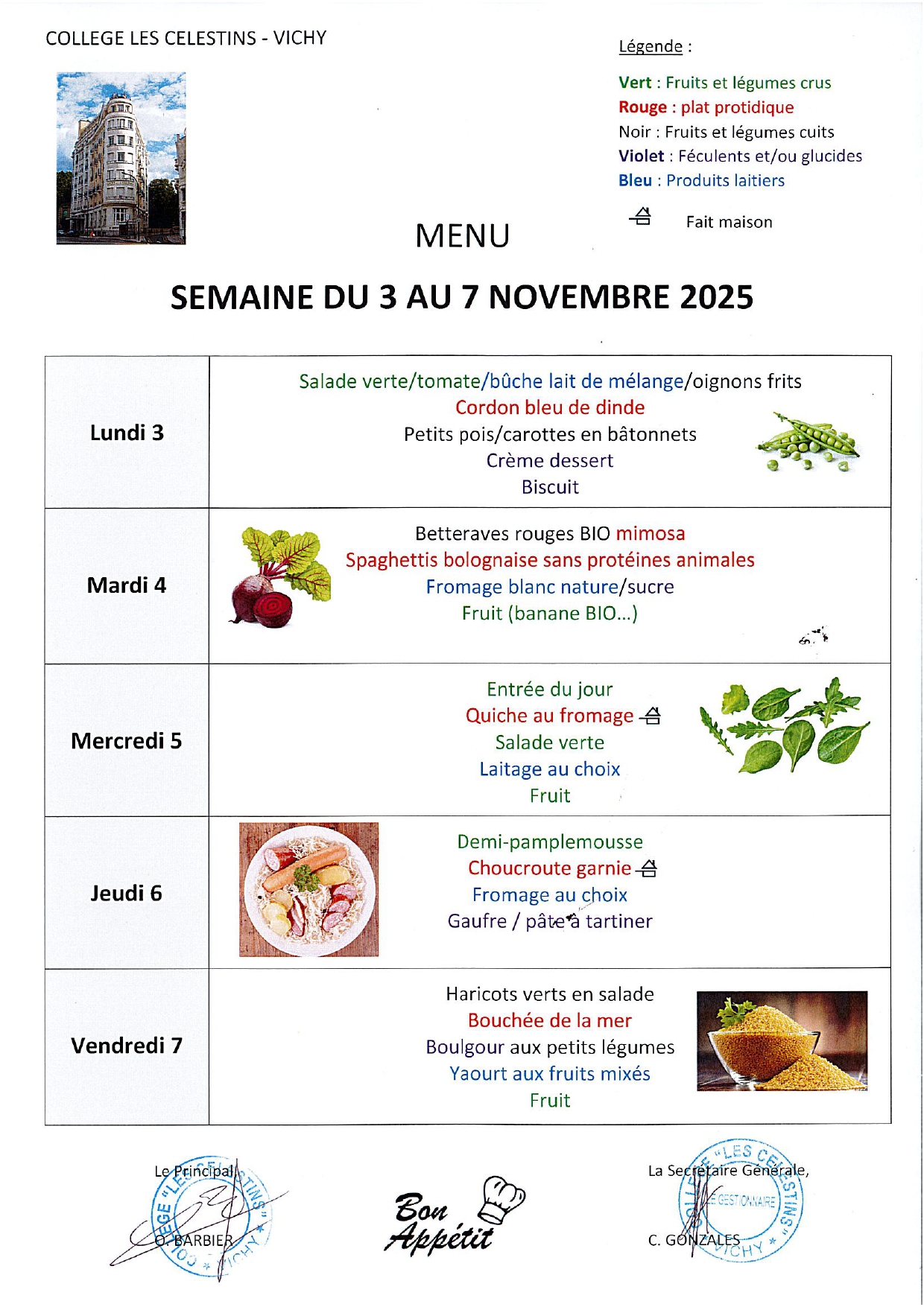 MENU DE LA SEMAINE DU 3 AU 7 NOVEMBRE 2025