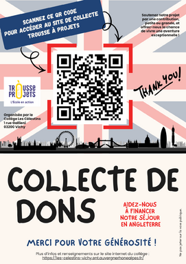 Par admin les-celestins-vichy, publié le mardi 6 janvier 2026 09:31 - Mis à jour le mardi 6 janvier 2026 09:31Il reste encore environ 15 jours avant la fin de notre collecte. Alors mobilisons-nous tous et redoublons d’effort pour atteindre le montant minimum de notre cagnotte et ainsi permettre à nos 50 collégiens de vivre une expérience unique ! -